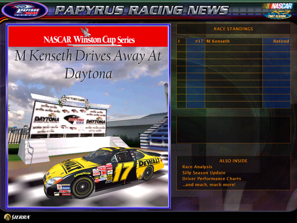 Use this template to create a trkwin newspaper picture. This template includes the border used by all N2003 trkwin files. It also includes both a Winston Cup title or a Busch Grand National title instead of the "NASCAR Racing Series" title the stock tracks use. There is a shadow layer included for the car when it is displayed in the newspaper.